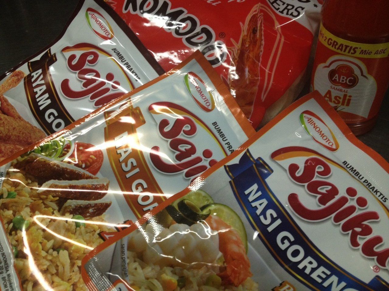 チリペッパーソース・海老せんべい・ナシゴレンの調味料3種。