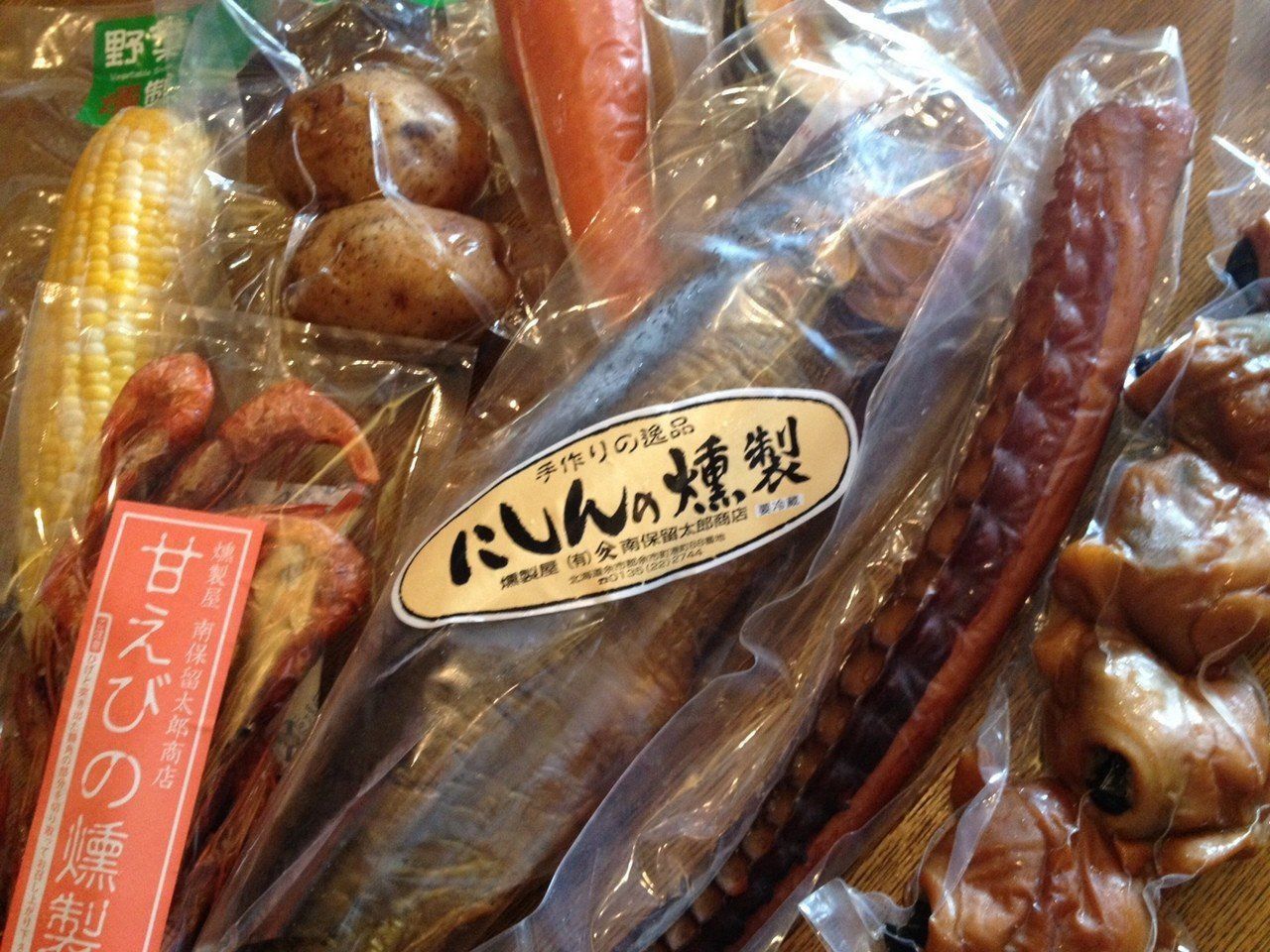 燻製は、余市の南保留太郎商店というところのもので、蛸・蛸のトンビ・にしん・甘エビ・じゃがいも・人参・南瓜・とうもろこし・等々の詰め合わせ。香ばしく燻した味と風味がとても美味です。