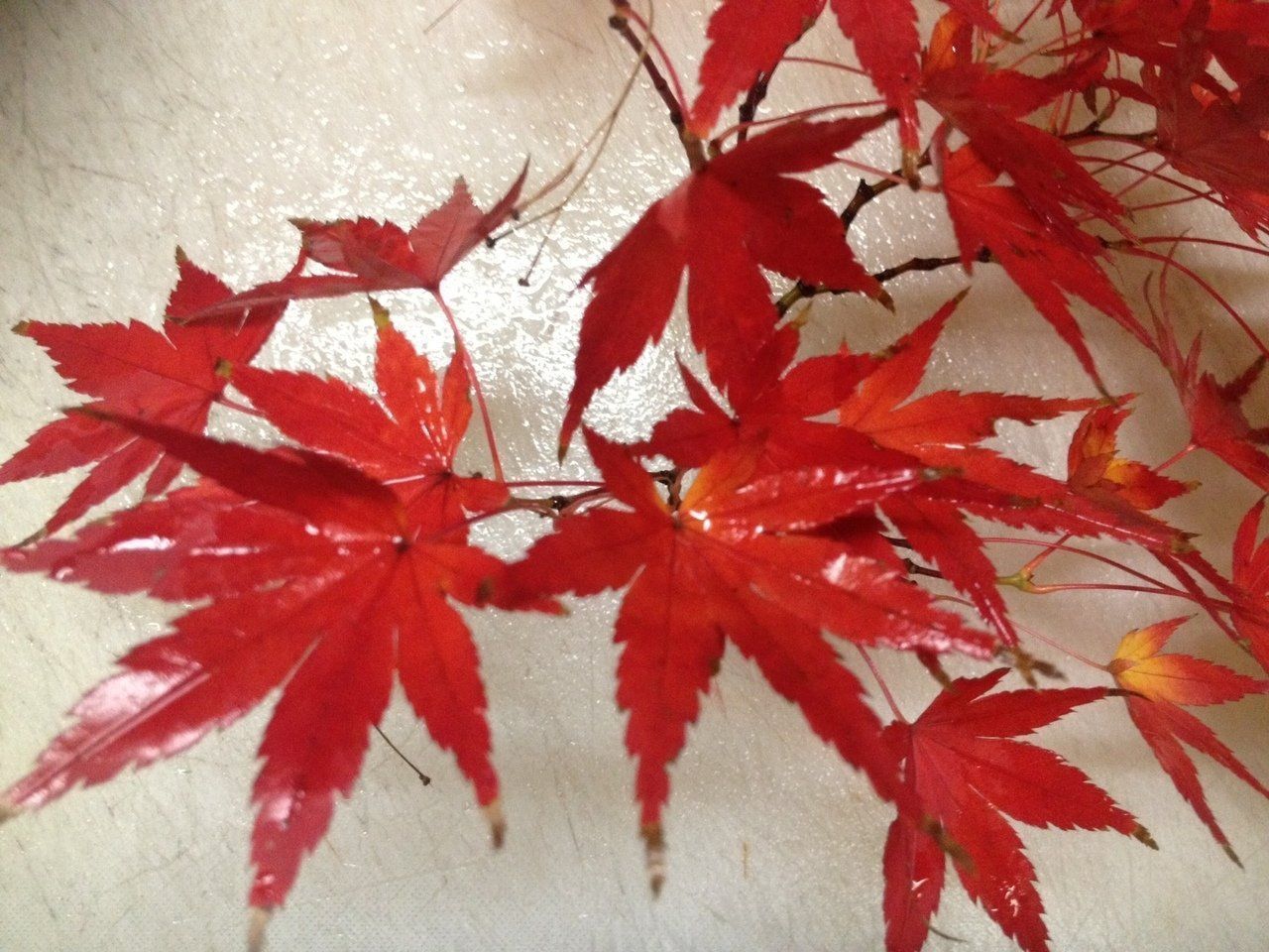 お店のお料理に添えるカエデも真っ赤に色づきだしました。自然の紅色。