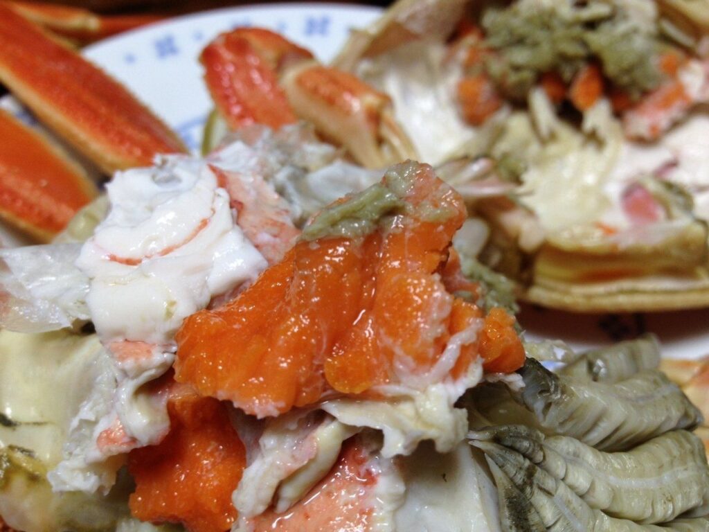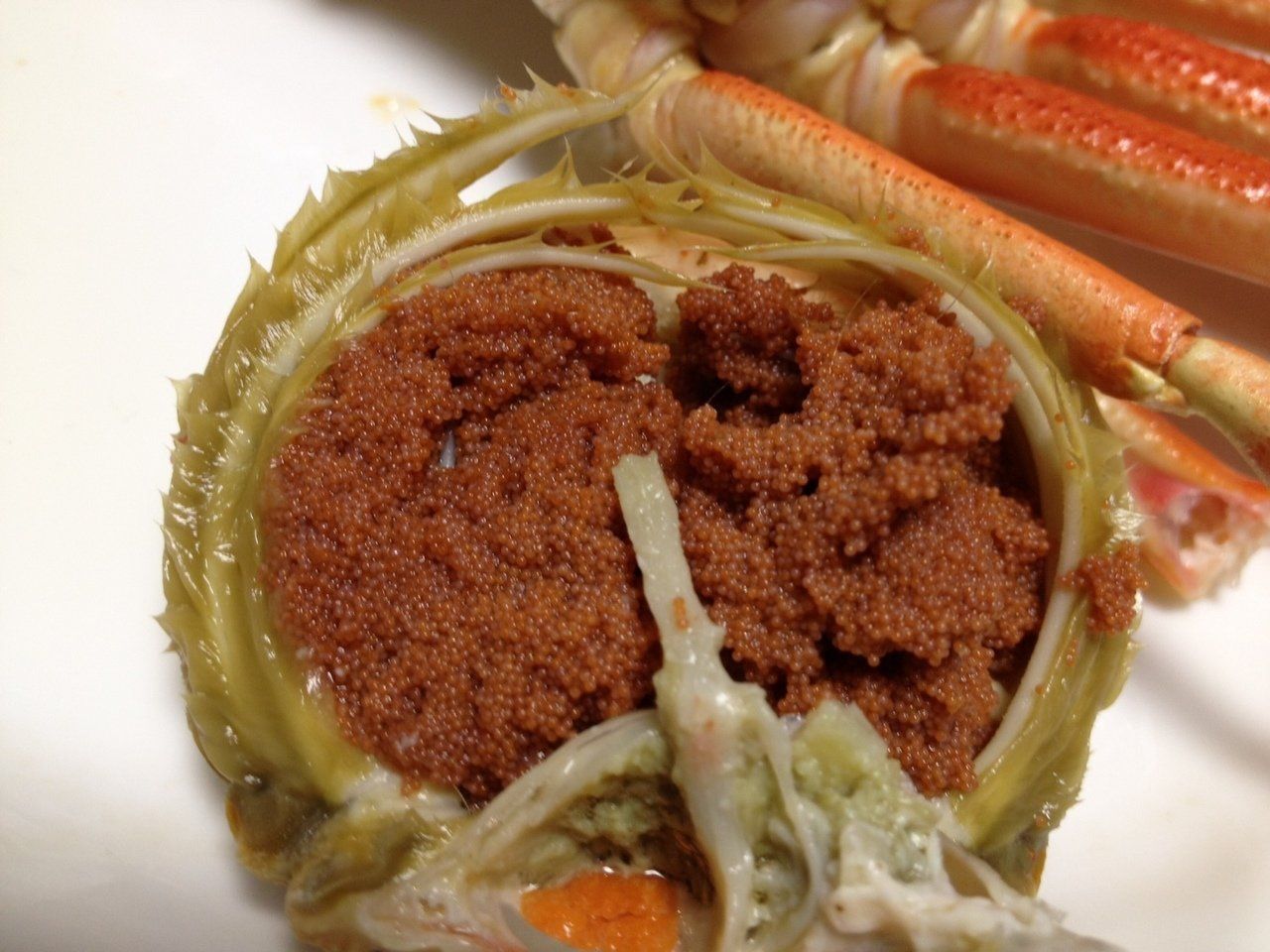 綺麗なオレンジ色した内子(未成熟卵)とカニみその登場です。