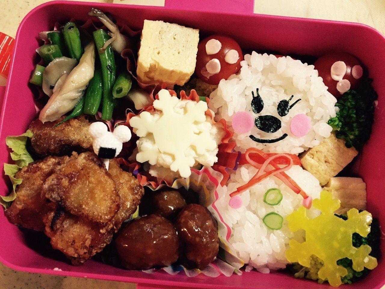 ご飯を雪だるまに見立ててます。ミニトマトの耳にチーズのドット。海苔のお目々とお口、頬は蒲鉾のピンクの部分。