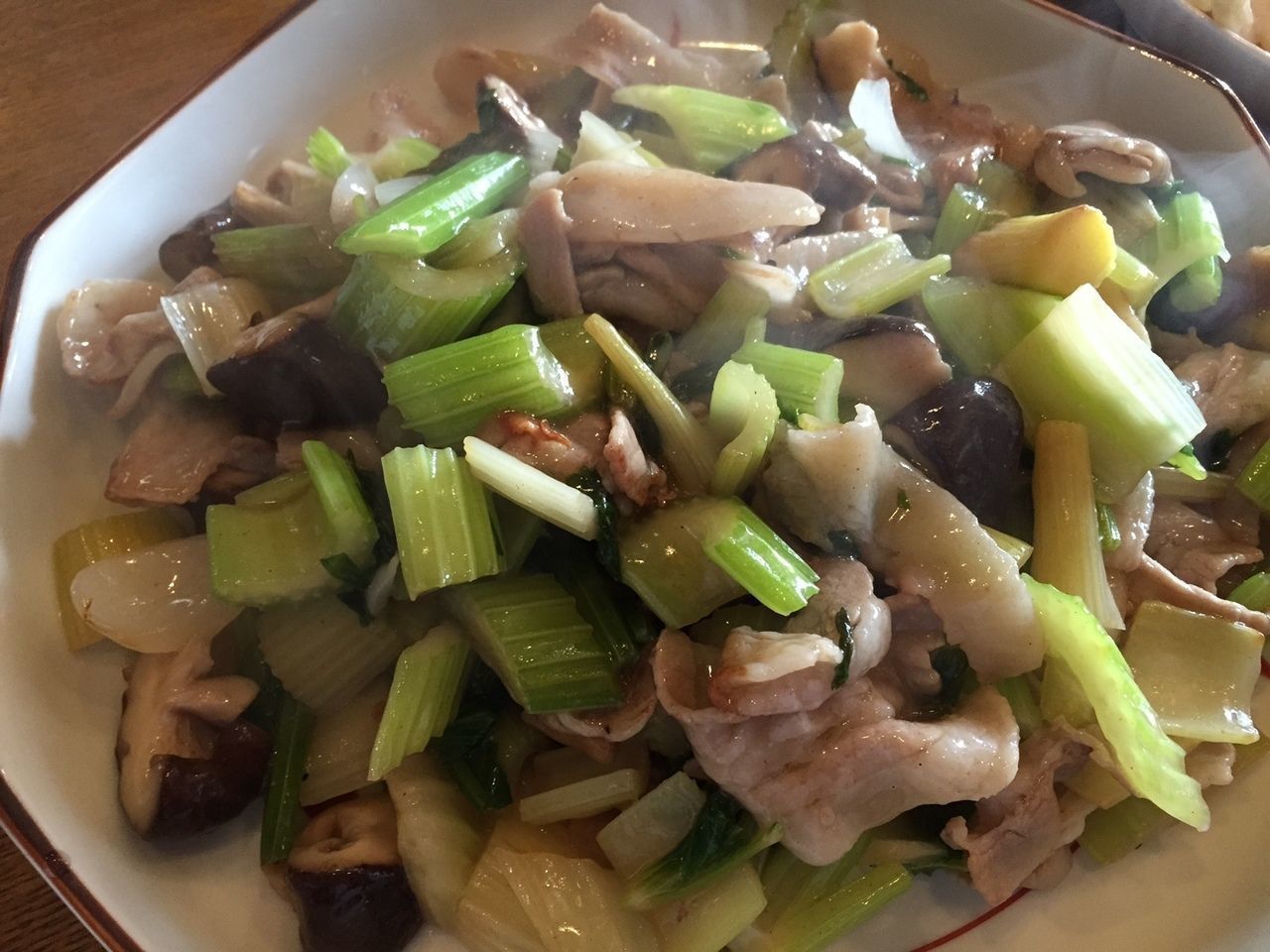 今日は、賄いで『セロリと豚バラ、シイタケの炒め物』にしてみました。