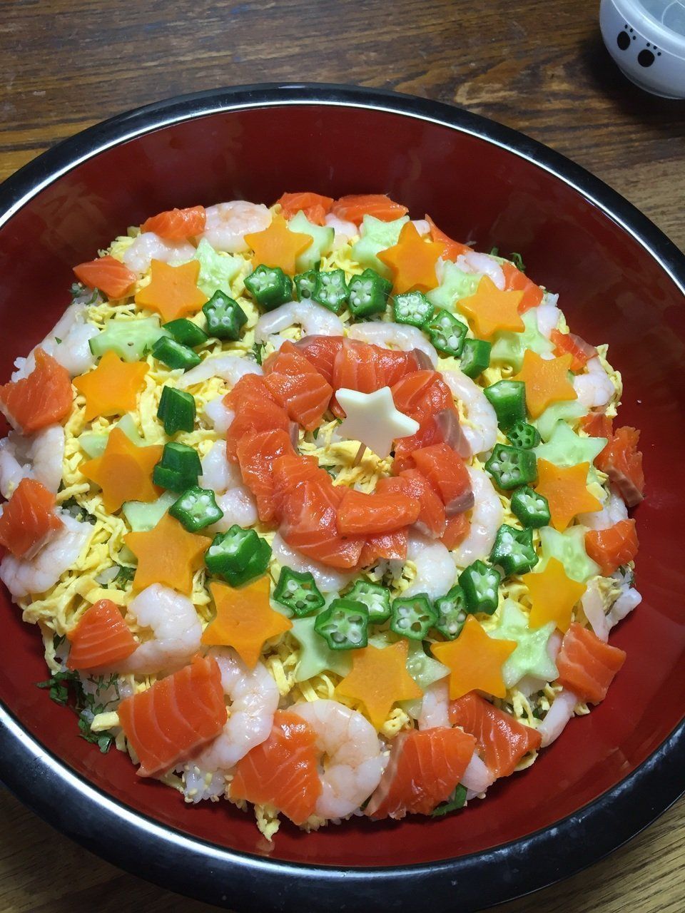すし飯に錦糸玉子を敷き詰めて、その上に、星形の人参、星形の胡瓜、オクラを小口にカットしたもの(こちらも断面が星形)他、魚介は海老とサーモンを使い、彩り良く仕上がりました。