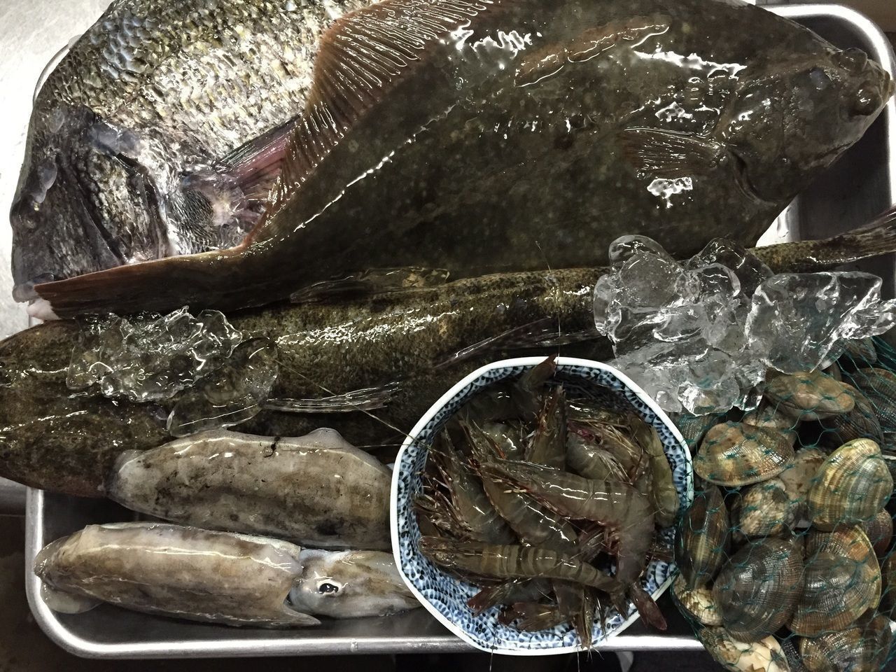 上から黒鯛、石鰈(イシガレイ)、鯒(コチ)、下は左から甲イカ、赤足海老、あさりです。
