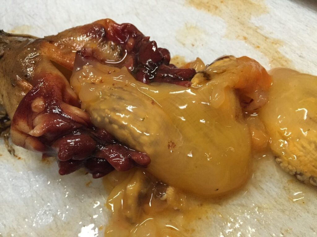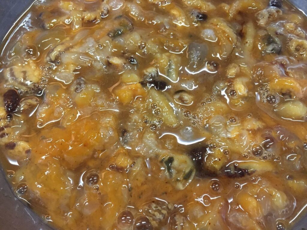この様に中から、オレンジ色の身が顔を覗かせます。味はというと、磯というか潮の香りというか強烈な香りと共に、独特の味が口に、広がります。