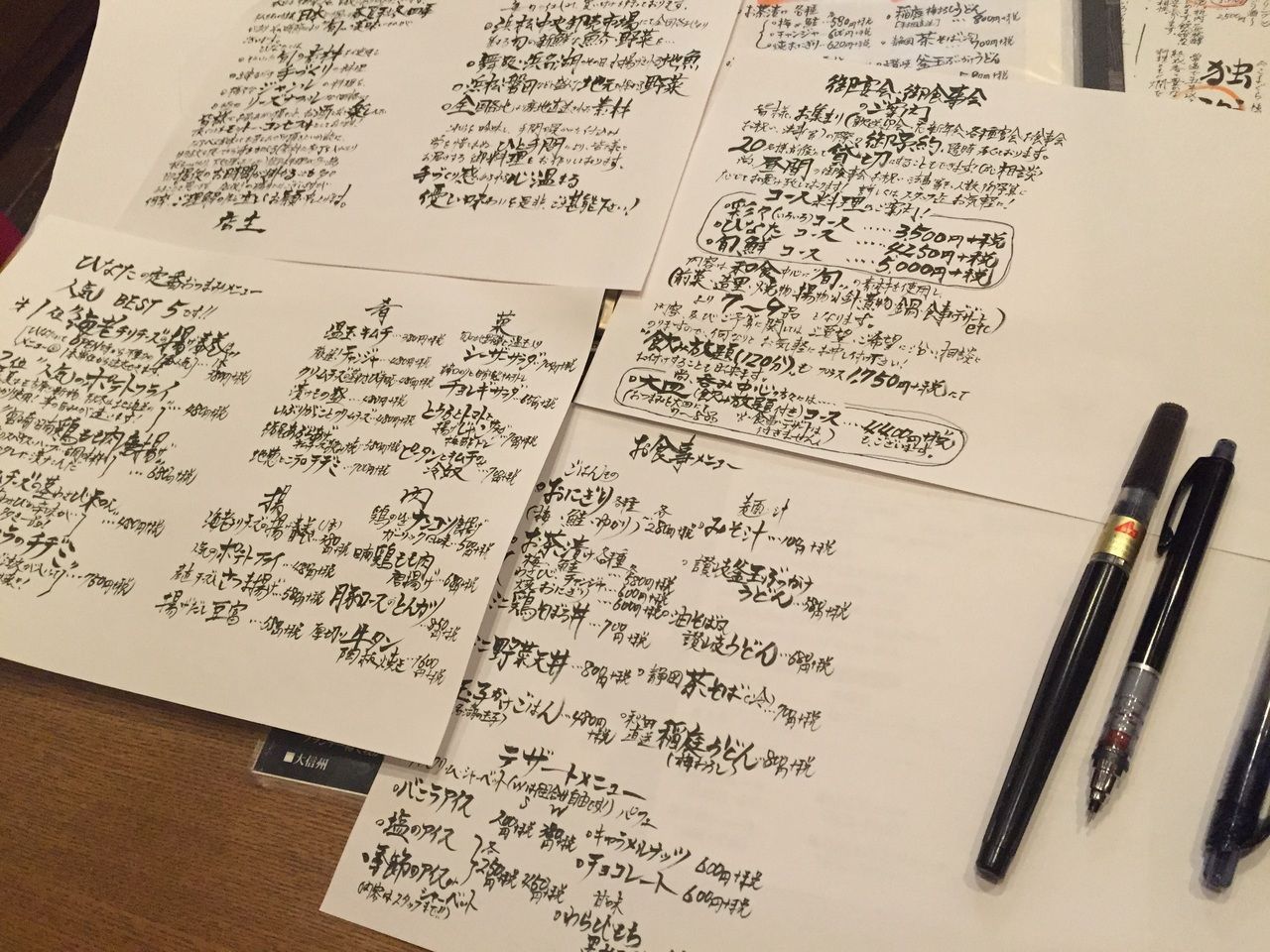 構想、仕込みの時間と手間、オーダーが実際入った際の段取りとスタンバイなどを加味しつつ、メニューを考え、せっせとこんな感じで空いた時間を使い、下書きを書いては捨て書いては捨てと繰り返し、やっと完成です!