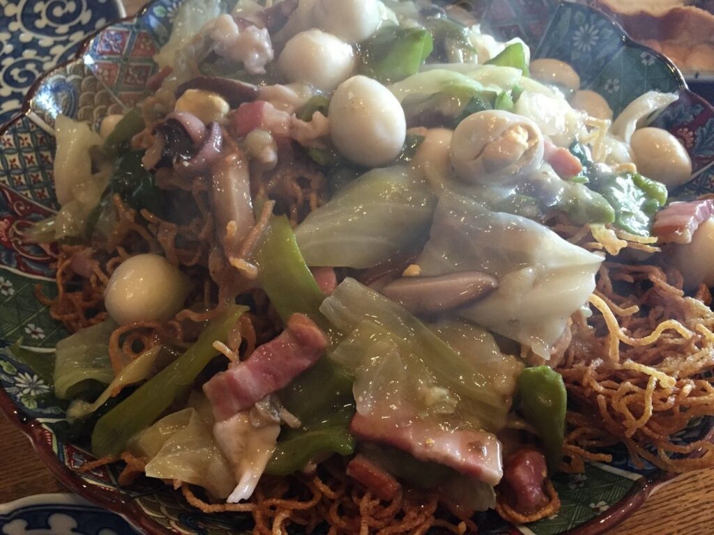 先日、常連さんのNさんから、たくさんの茹でたうずらの玉子を頂きました。 そちらを使って、本日の賄い! 『揚げソバの中華あんかけ』です。 生の中華麺を、バリバリっと高めの温度の油で揚げたものに、お肉と残り物のイカゲソ、お野菜(キャベツ、空心菜...