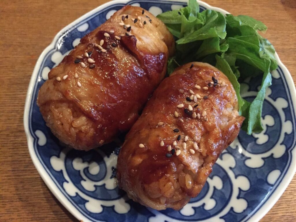 先日賄い【肉巻きにぎり】です。 焼肉のタレをまぶした白飯を、俵の形ににぎり、豚のもも肉の薄切りで巻きつけて、フライパンの上で転がしながら火を入れます。最後にまた、焼肉のタレを絡めたら完成! ひなたママ作です。 -